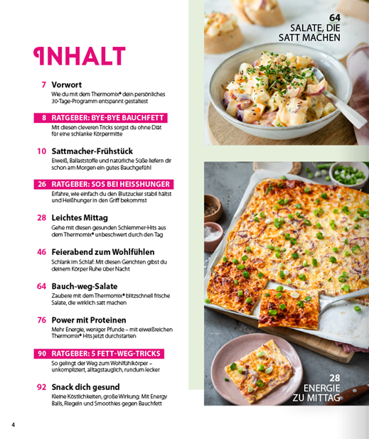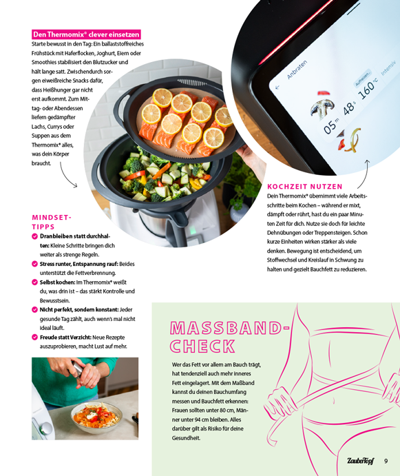 Der Thermomix® macht’s leicht: Alle Rezepte, die Auswahl der Zutaten und die Wochenpläne sind optimal auf das Gerät abgestimmt – so übernimmt der Thermomix® Zerkleinern, Dampfgaren, Mixen und Kochen. Das spart Zeit, reduziert Stress und macht gesunde Ernährung im Alltag endlich machbar. Das moderne 30-Tage-Konzept bietet eine klare Struktur und hilft, Schritt für Schritt gezielt Bauchfett loszuwerden. Viele Gerichte lassen sich gut vorbereiten und kommen mit einer Handvoll guter Zutaten aus, was für noch mehr Alltagstauglichkeit sorgt und die Motivation hochhält.