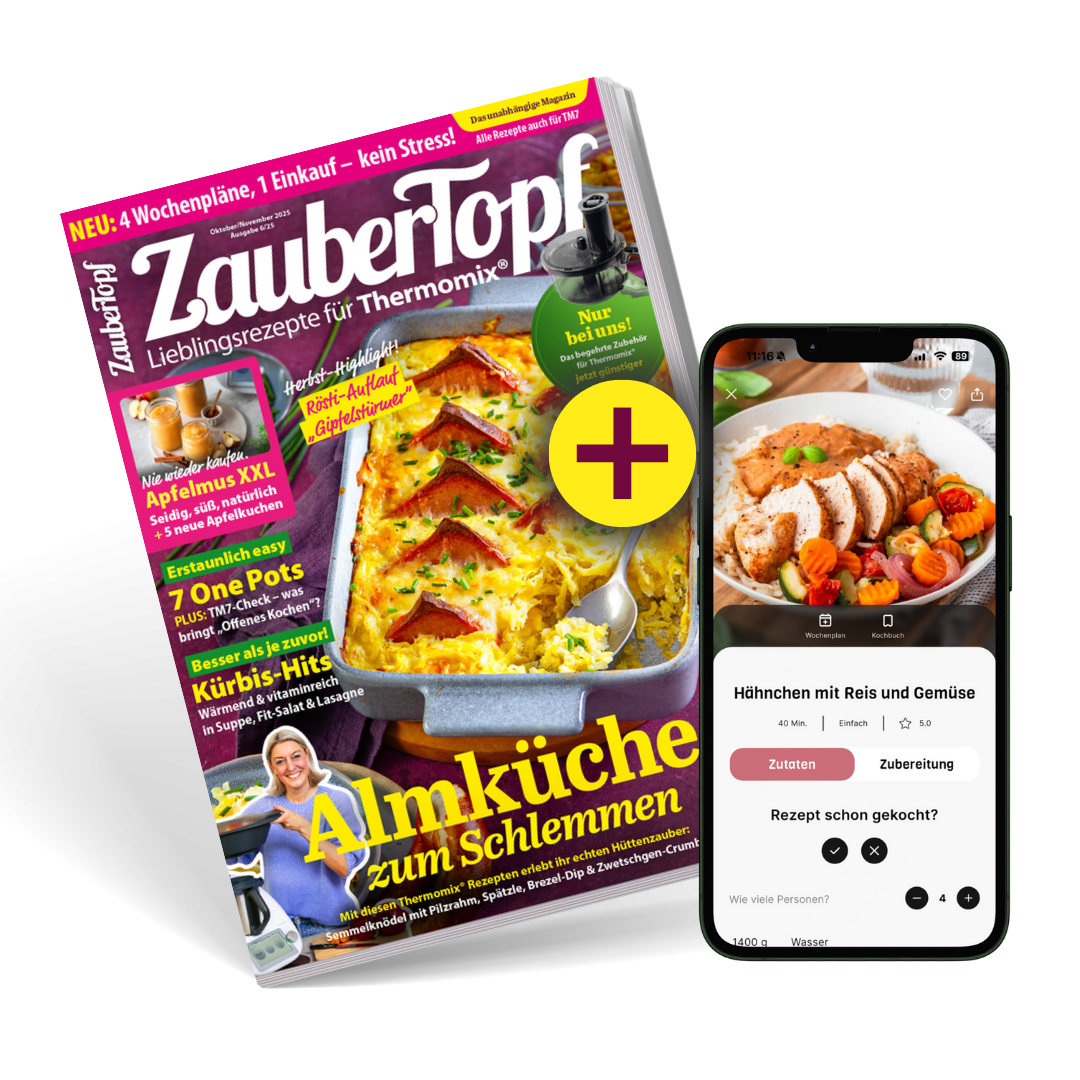 Mit der neuen Ausgabe von ZauberTopf wird die goldene Jahreszeit zu einem Fest voller Aromen! HERBSTLICH BUNT & VOLL VON GENUSS! Mit der neuen Ausgabe wird die goldene Jahreszeit zu einem Fest: Freu dich auf Kürbisgerichte, die wärmen und überraschen, Apfelträume von saftigen Kuchen bis fluffigen Hefeschnecken und cremige One-Pots, die gemütliche Abende noch schöner machen. Dazu zeigen wir, wie Reis im Thermomix® garantiert gelingt – mal klassisch, mal kreativ. Von Soulfood an Regentagen über süße Desserts bis zu smarten Meal-Prep-Ideen: Diese Ausgabe liefert Inspiration für jeden Herbstmoment – unkompliziert, abwechslungsreich und richtig lecker.